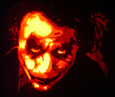 As promised before, here is my newest creation. These were both carved using a wood-carving exacto knife set. Nothing fancy, just tedious dedication. This is a Heath Ledger Joker pumpkin carving. I created the pattern myself using Photoshop. This one took me about nine hours, start to finish, including creating the pattern, transfer, gutting, and of course, carving. Could I have spent this time doing something else? Sure, but then I wouldn't have a piece of transient art, shining in all its decaying glory!