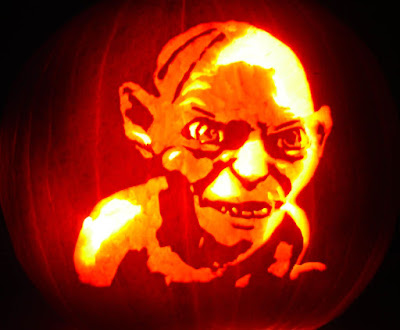Also, here is a better picture of my previous Gollum pumpkin, now properly lit with 40 watts of glory.